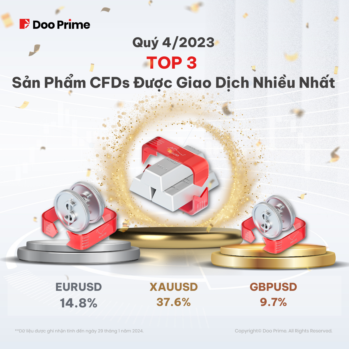 Bên cạnh kết quả của chiến dịch trong năm 2022 & 2023, chúng ta hãy cùng điểm lại sản phẩm sản phẩm sở hữu hiệu suất tốt nhất trong quý 4 năm 2023, với cặp XAUUSD chiếm 37.5%, EURUSD chiếm 14.8%, và GBPUSD ở mức 9.7%.