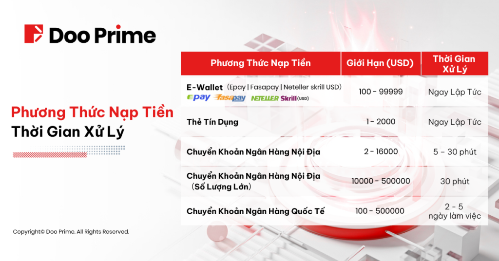 Tại Doo Prime, đối với một giao dịch đơn lẻ bằng ngoại tệ trong ngày hoặc giao dịch có giá trị tích lũy trên 10.000 USD, khách hàng có thể lựa chọn nạp tiền qua ngân hàng nội địa với thời gian xử lý chỉ 30 phút. Đối với phương thức chuyển khoản ngân hàng quốc tế, toàn bộ quá trình chỉ mất từ 2-5 ngày làm việc.