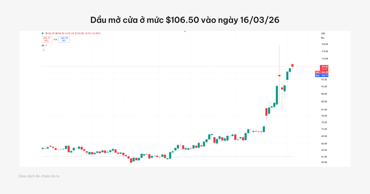 Ngày 16/03/2026, dầu Brent mở cửa ở mức $106.50, vượt mốc tâm lý $100 với động lực tăng mạnh.