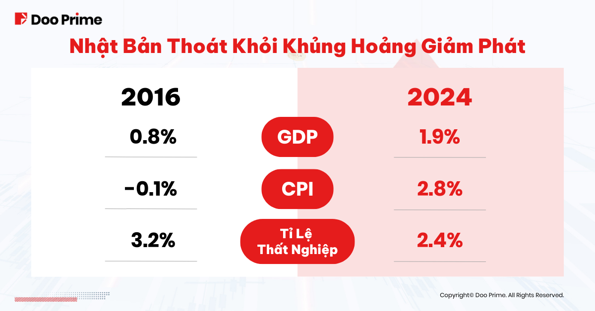 Mức tăng trưởng GDP thực tế của Nhật Bản đã tăng từ 0,8% trong năm 2016 lên 1,9% trong năm 2023.