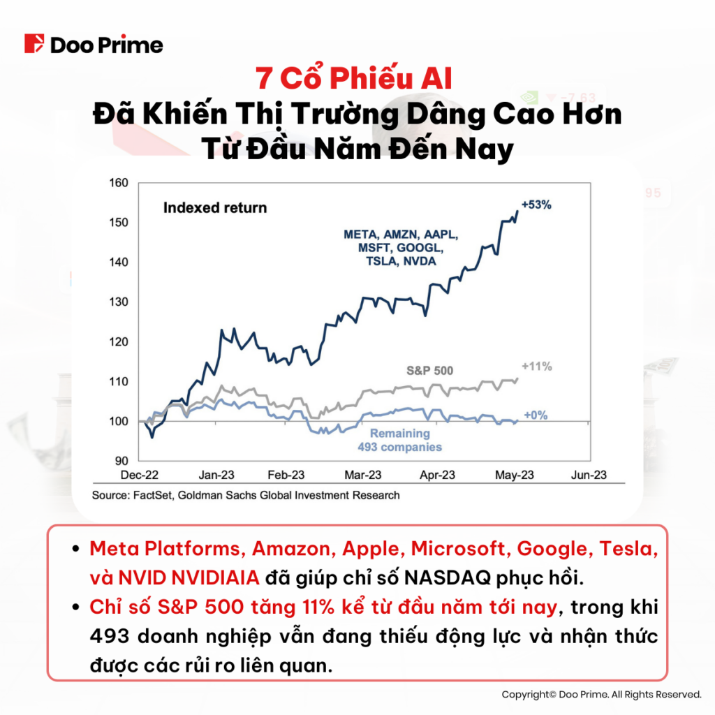 Cơn “sốt” về AI đã thống lĩnh thị trường trong thời gian vừa qua. Bằng chứng là, các nhà đầu tư đang ngày càng lạc quan về tương lai của ngành công nghệ mới này mà quên mất đi các lĩnh vực khác trên thị trường hiện nay. 7 loại cổ phiếu AI được đề cập đều sở hữu mức tăng trưởng mang tính lịch sử trong những tháng gần đây. Trong số đó, Meta Platforms đã ghi nhận mức giá cổ phiếu tăng hơn gấp đôi kể từ hồi đầu năm. Tuy nhiên, cũng trong cùng khoảng thời gian này, hầu hết các công ty trong nhóm S&P 500 đều chưa có đủ động lực để thực sự bứt phá.