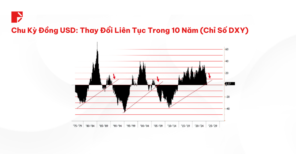 Biểu đồ trên đây cho thấy cách thức mà đồng USD hoạt động theo mô hình chu kỳ 10 năm. Theo đó, mỗi chu kỳ thường kết thúc bằng một sự đảo ngược mạnh. Riêng đối với thời điểm hiện tại, chỉ số DXY dường như đang ở giai đoạn đầu của một đợt suy thoái lớn khác.