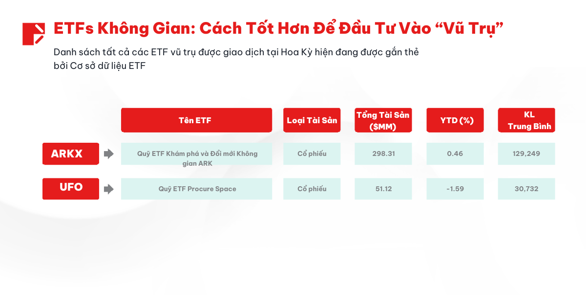 Ba khoản đầu tư lớn nhất của UFO là Rocket Lab, MDA Space Ltd. (MDA.TO), và Globalstar Inc. (GSAT), mỗi khoản chiếm 6% danh mục, tổng cộng hơn 25% tài sản của quỹ. Với danh mục tương đối tập trung gồm 35 cổ phiếu, UFO có tỷ lệ chi phí 0,75%, nhưng mức hiệu suất ấn tượng trong năm qua đã bù đắp đáng kể.