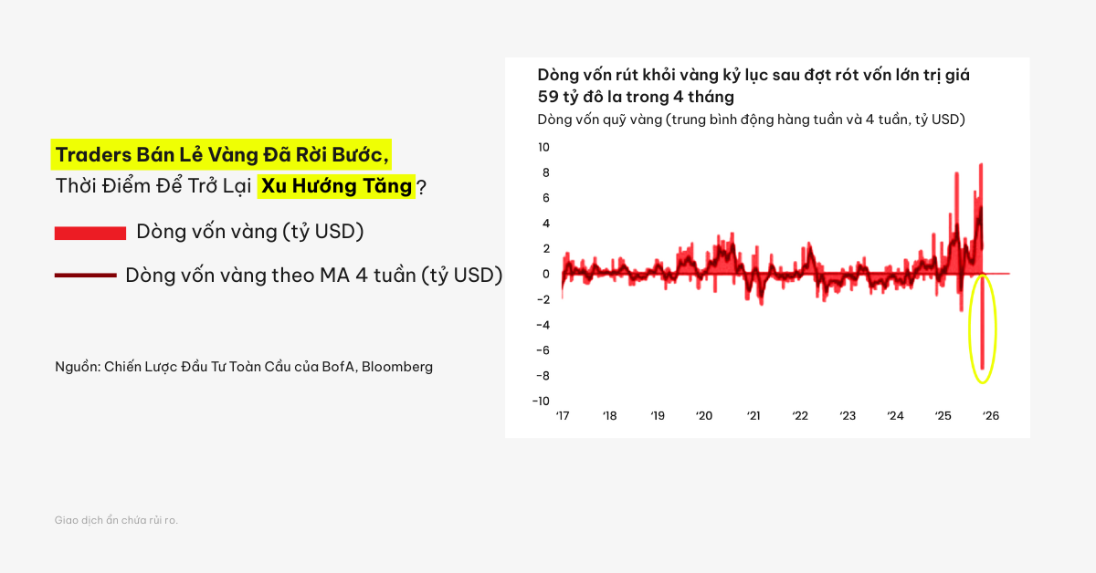 Biểu đồ cho thấy, dòng vốn tháo chạy khỏi các quỹ vàng đạt mức kỷ lục, tương đương gần 59 tỷ USD trong vòng bốn tháng vừa qua.