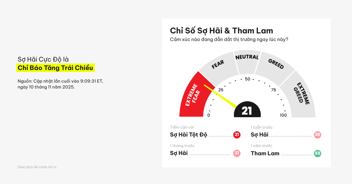 Theo Chỉ Số Sợ Hãi & Tham Lam của CNN, thị trường hiện đang nằm sâu trong vùng “Sợ Hãi Cực Độ” với điểm số 21/100.