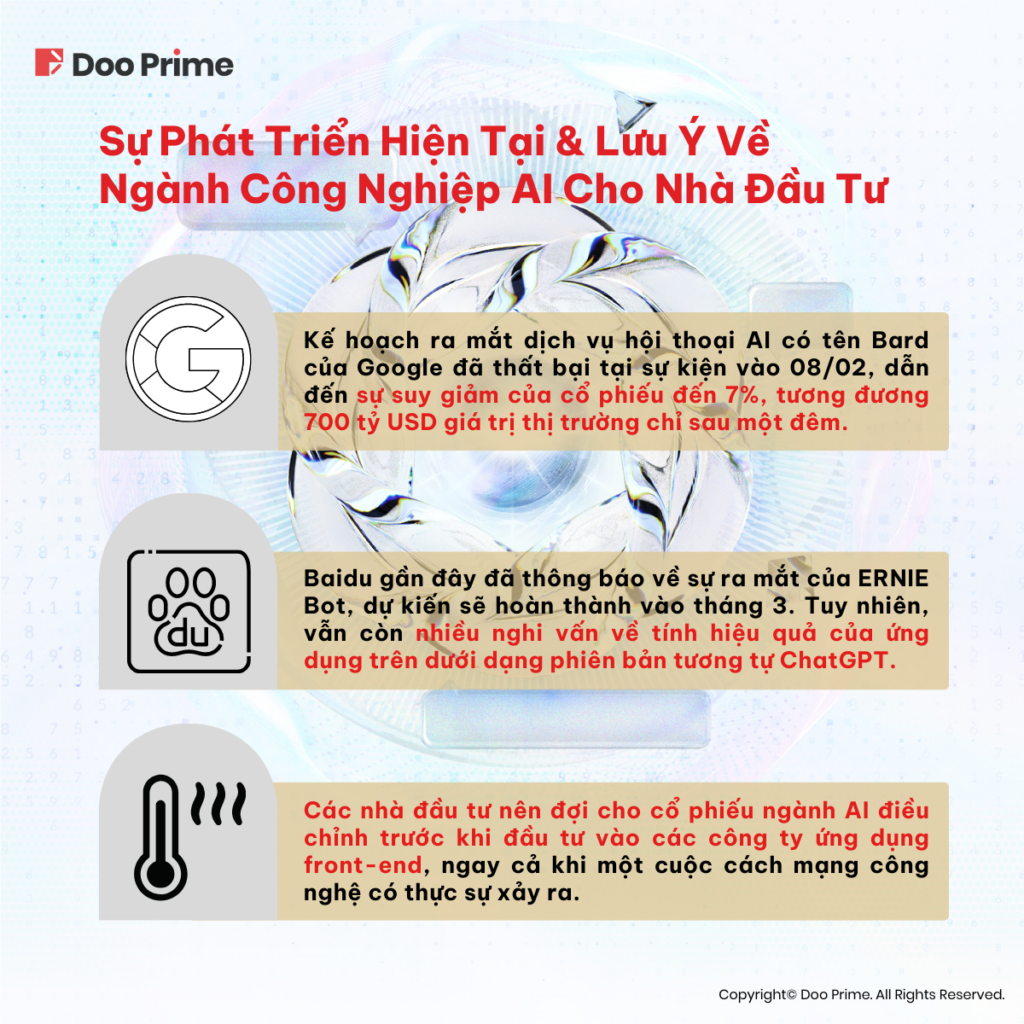 Ngoài ra, sự tăng trưởng đột biến từ giá cổ phiếu của các công ty ứng dụng AI mảng front-end đã khiến các nhà đầu tư tiến hành giao dịch với niềm tin đặt trọn vào sự tăng trưởng của làn sóng trên. Tuy nhiên, cần lưu ý rằng, một đợt điều chỉnh cổ phiếu trên diện rộng có thể sẽ xảy ra và các nhà đầu tư cần cân nhắc kĩ lưỡng trước khi chính thức đầu tư vào các công ty ứng dụng AI mảng front-end.